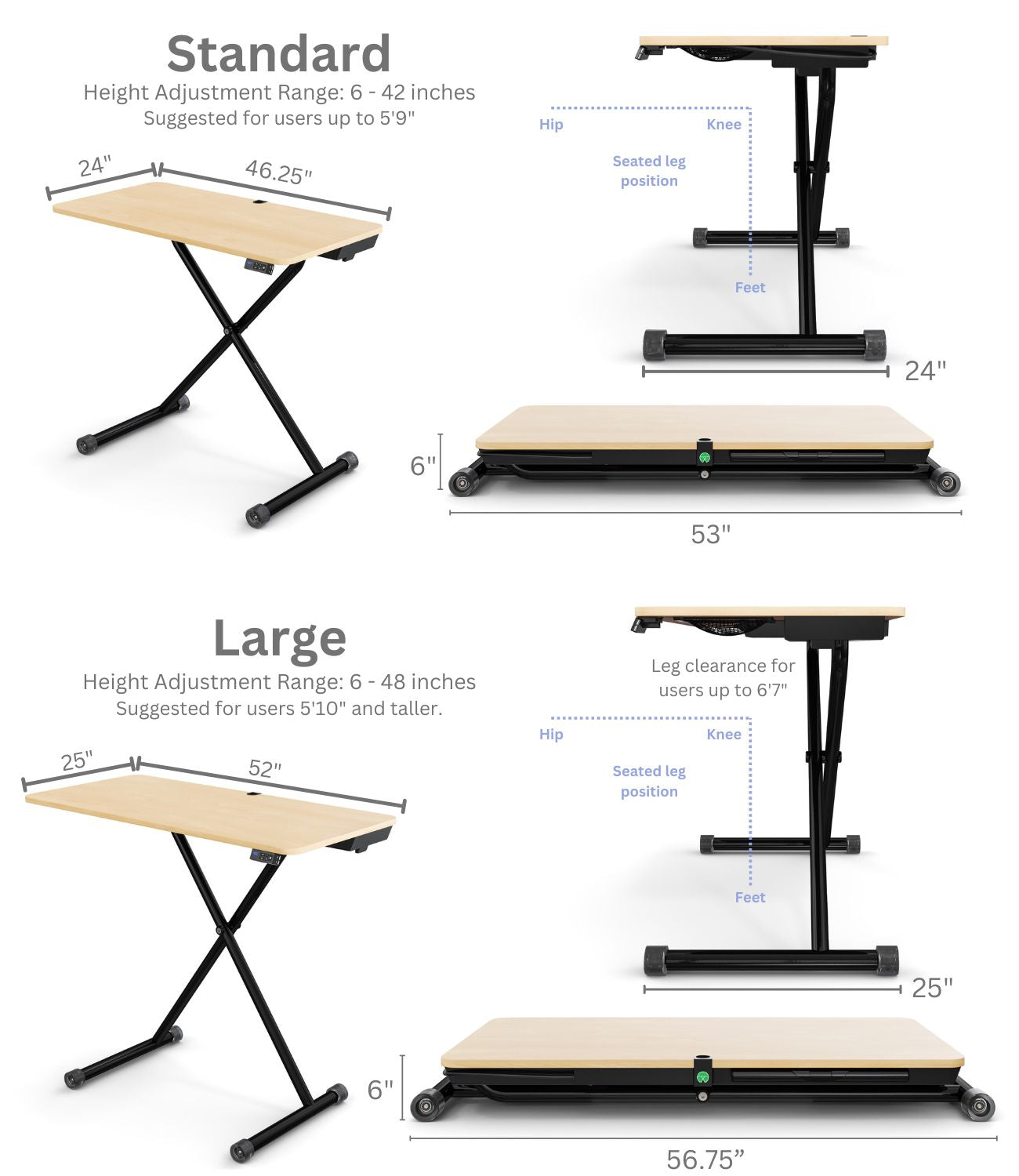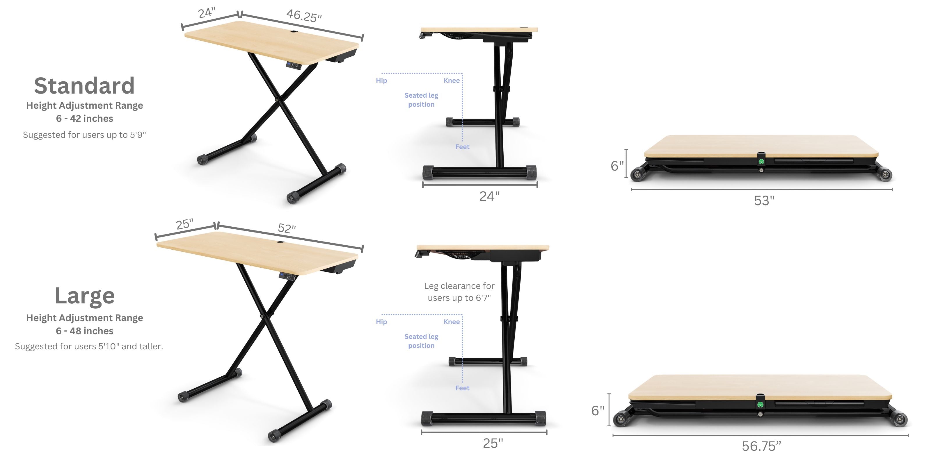 Our standard Lillipad offers a desktop size of 46" x 24" with maximum standing height of 42". We recommend our standard size for individuals who are 5'9" and below.